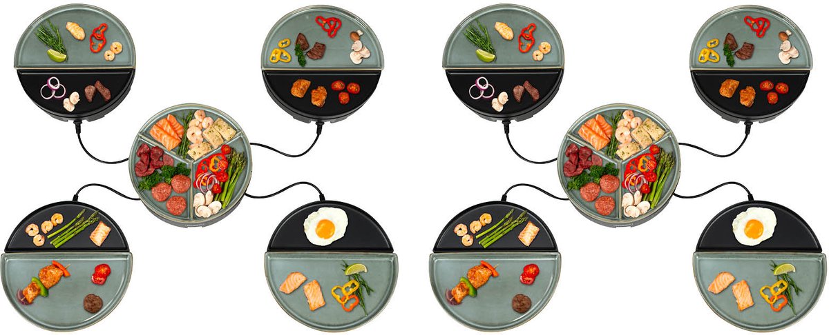 Wat deze set extra praktisch maakt, is dat je slechts één aansluitsnoer nodig hebt per 4 units, waardoor je dus maar 2 aansluitpunten hebt. Elk snoer is 1,2 meter lang, wat extra flexibiliteit op tafel biedt. De Chef’s Dinner Party voor 8 personen maakt het koken met een grotere groep eenvoudig en gezellig. Let op: dit betreft twee 4-persoons Chef’s Dinner Parties.