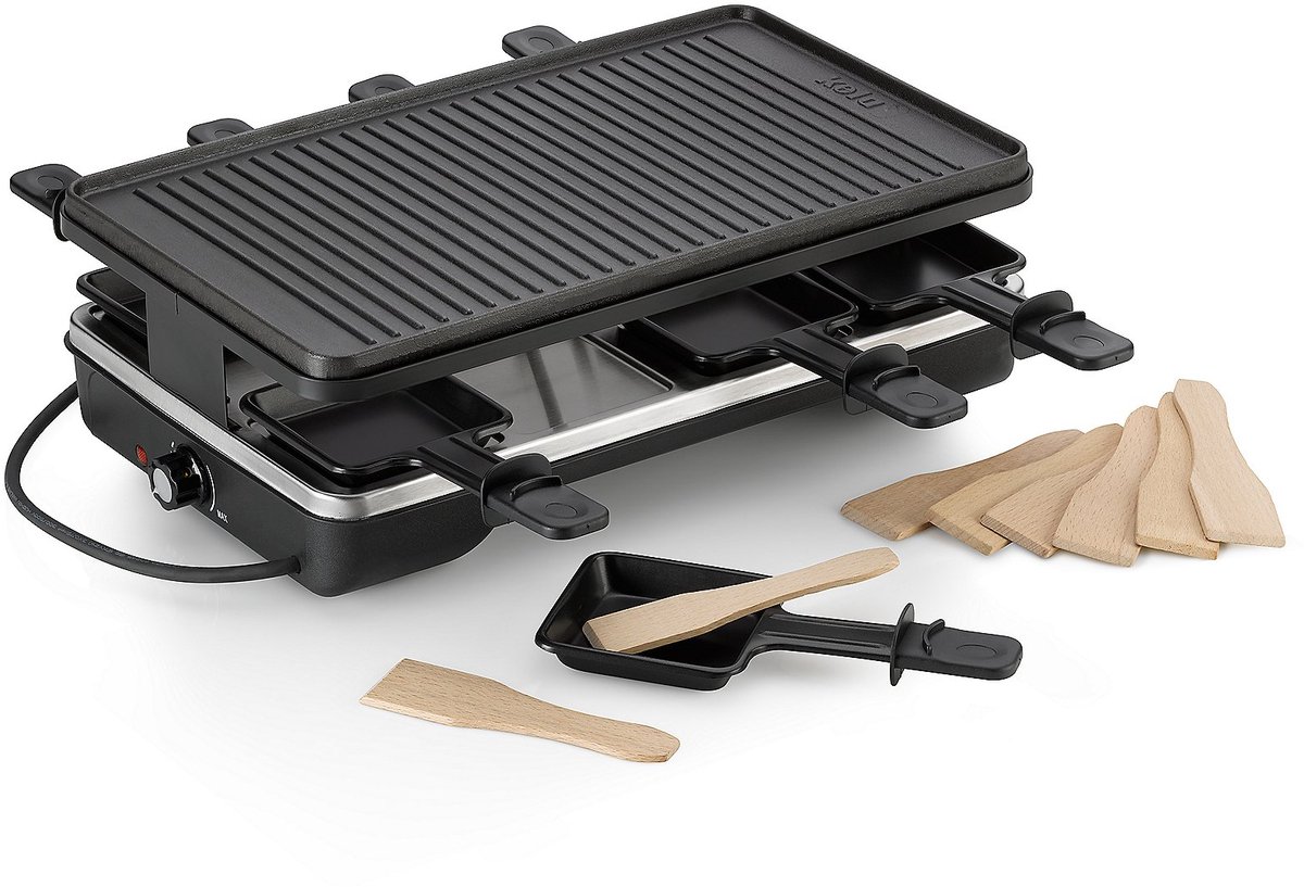 Heerlijk een avondje gezellig gourmetten met familie of vrienden, wie heeft daar nu geen zin in? Haal heerlijk gourmetvlees van de keurslager in huis, koop lekkere bijgerechtjes zoals stokbrood en verse groenten, bereid lekkere sausjes en drink er een lekker wijntje bij om heerlijk te kunnen gourmetten! Of je nu kleine hamburgertjes wilt bereiden, heerlijke pannenkoekjes of juist lekker gaat combineren met verschillende groenten, niets staat je in de weg met deze gourmetset uit de Geneva-serie van Kela! De set bestaat uit een gietijzeren gourmetplaat, acht stalen gourmetpannetjes en acht houten spateltjes om jouw vlees, vis of groentes mee te bereiden. Bovendien zijn de pannetjes voorzien van een anti-aanbaklaag, waardoor je extra veel gemak rond het gourmetten hebt zonder aanbranden! Uiteraard is het wel verstandig de pannetjes wat in te vetten met olie of boter. De plaat werkt op stroom met een sterkte van 1200 Watt en heeft een kabel van twee meter lang! De warmte regel je eenvoudig met het draaiknopje en het indicatielampje geeft aan of de temperatuur goed is. Een complete set voor het hele gezin!