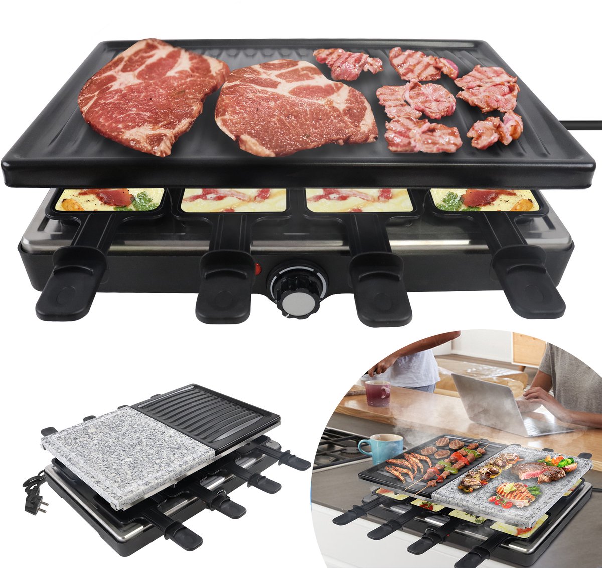 Raclette-Gril Voor 8 Personen Multi-Gril Met Steinplaat En Grillplaat, 1400W Tafelgril – 8 Pannen En Houten Spatel, Stelbaar Temperatuurgeregelde Elektrogril Voor Binnengrillen (0751203705529)