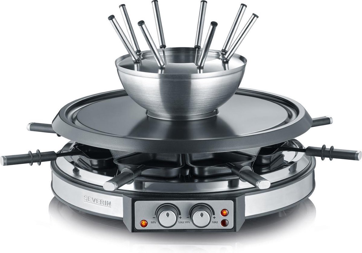 De Severin RG2348 is een 2-in-1-combinatie van raclette en fondue. Dit apparaat kan gebruikt worden voor maarliefst 8 personen. De Severin RG 2348 heeft een hoogwaardig, roestvrijstalen design en comfortabel XXL-snoer van ca. 2 meter. De grillsteen van ongeveer 13 cm houdt de gerechten warm en zorgt voor een goede bereiding van vis en groente.
